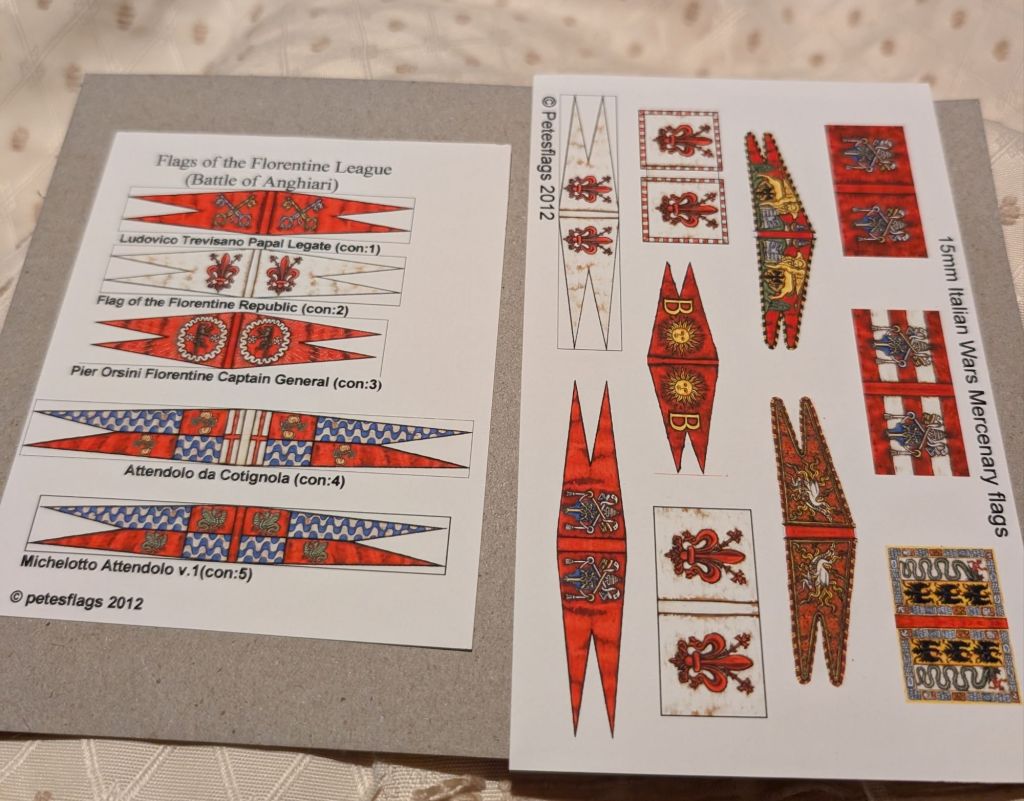 Anyway I decided I needed more Flags. So off to the fabulous Pete’s Flags on eBay. I came across two sheets one a Florentine Mercenary set and the other from the Florentine League at the battle of Anghiari.
