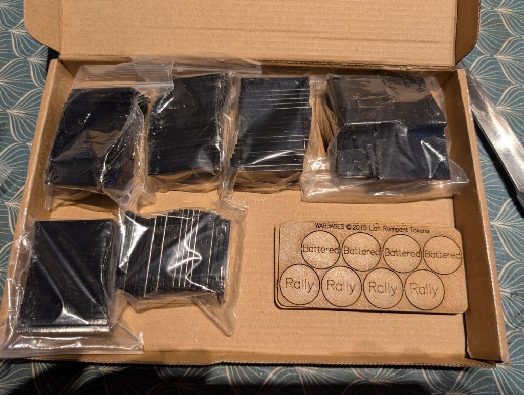 I was wanting 20x40mm and 30x40mm in plastic and no-one could do both in standard packs. Warbases did clear plastic, but I am a fussy bugger and didn’t want to see miniature bases and superglue from underneath. They were happy to make them out of whatever colour I wanted. It did incur an 80 pence increase per pack, but I was pre-warned that the coloured plastic was more expensive. I felt it was worth it as I got what I wanted
