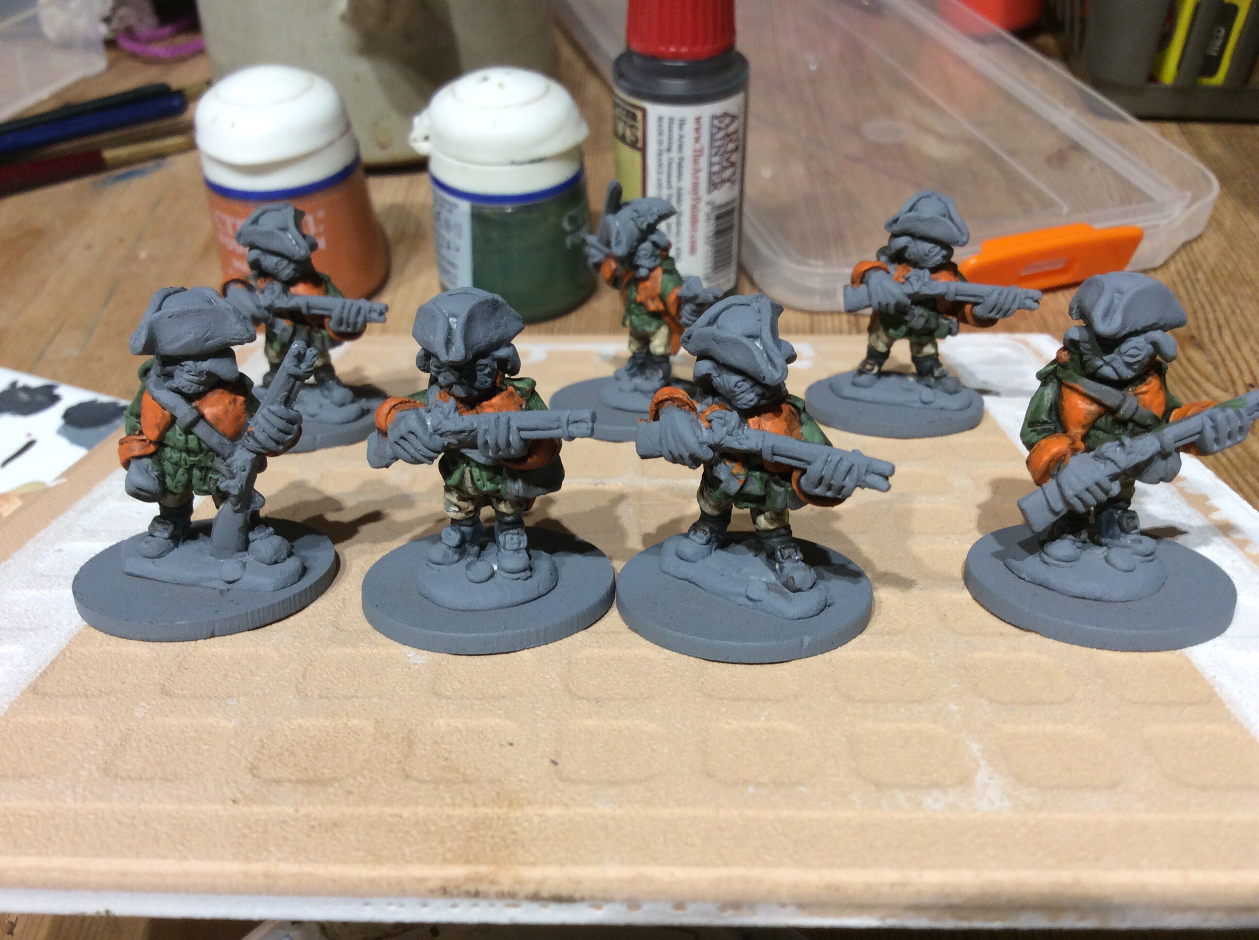 I cracked on with the pugs tonight. Rather than the purple and yellow of the Von Mohlblume line infantry I decided to make these into some Jäger. I have a back story, sort of, formulating as to the colours of the uniform. Needless to say I think these are awesome figures. Little pug light infantry snuffling their way into the fray. I particularly like the officer with his one eye and tongue sticking out. These hardly had any mould lines let alone flash or vent marks. It took me twice as long to clean them up because I kept picking up ones I had already done. In the end I actually had to put the done ones straight into a box to ensure I didn’t pick them up again.