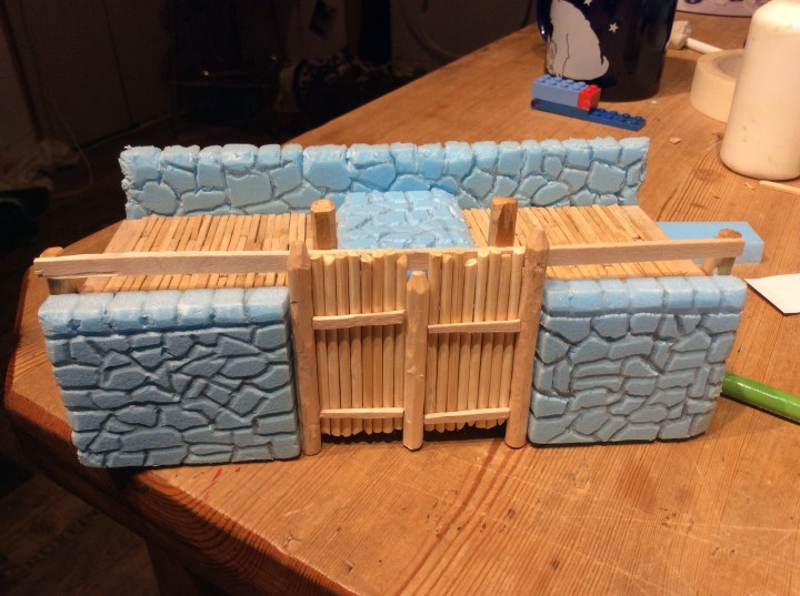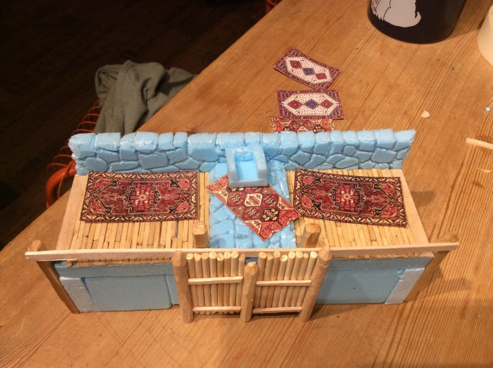 Still a load of work to do before Saturday, the time is taken up with waiting for the PVA to dry. I am still waiting on the internal palisade to dry. The carpet on the raised stones is to be draped over, the seat will be covered with cloth and if I have time- cushions.