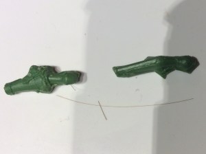 I had some green stuff handy so I used that. It has come out as a flexible piece which isn’t really useful, but the moulding is quite blurred and I will use it on bases and things like that but to actually put in the models hand? I doubt it very much.
