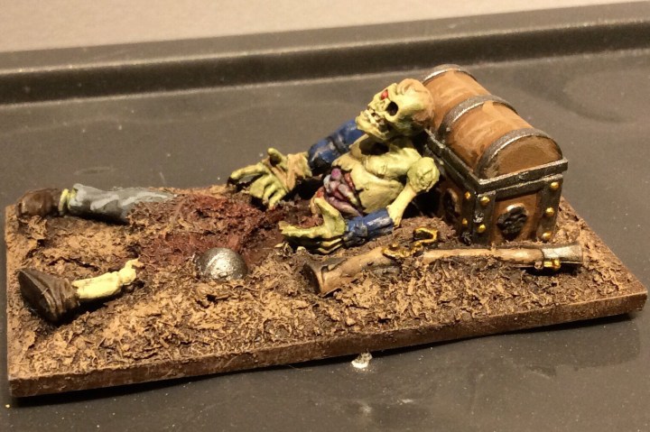 As it is for Flintloque the body may in fact be a trapped zombie protecting the chest. The only way to find out is to open the chest and see what it contains. Pay chest or perhaps an officer’s stock of best brandy. More than likely it will be nothing more than the records of the quartermaster.
