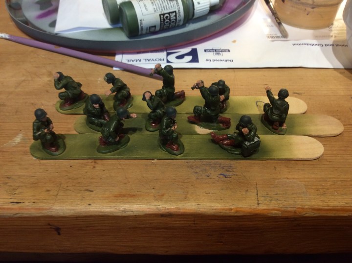 Working on the Americans. Base colours all just about done and the uniform wash applied. Next onto the highlights and washes for the rest. WW2 uniforms are so boring to paint after doing the Napoleonic uniforms. But as they say, a change is as good as a rest.
