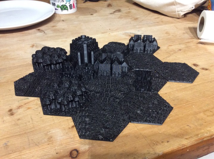 I don’t think I showed the keep and hill yesterday either. Now these weren’t quick prints. The keep and hill took 5 hours 30 minutes, the village tiles took slightly less at 5 hours 24 minutes and the four field tiles took 5 hours 48minutes. As for the cost for all 14 tiles. I weighed them to get the total weight. All 14 came in a 180 grams. Giving a total cost of £3.24. Now there has been 20+ hours worth of printing time. But still just over 3 quid isn’t too bad a price to pay. The other thing that dawned on me when I released the villages from the bed was that they would make ideal town (or villages) for 6 or 10mm wargames. I will see how they look when they are painted up.