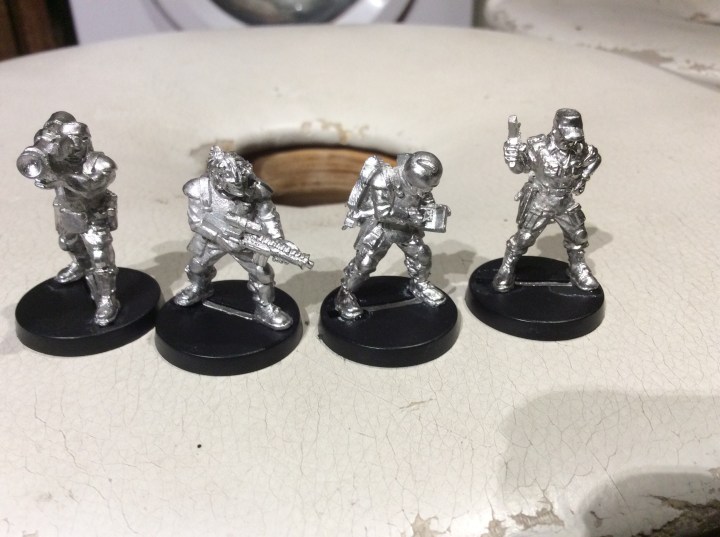 From left to right, heavy weapons, sniper/scout, comms and an obvious officer type. My initial idea is that in the RPG as the players specialise then they can choose a new miniature if they want.