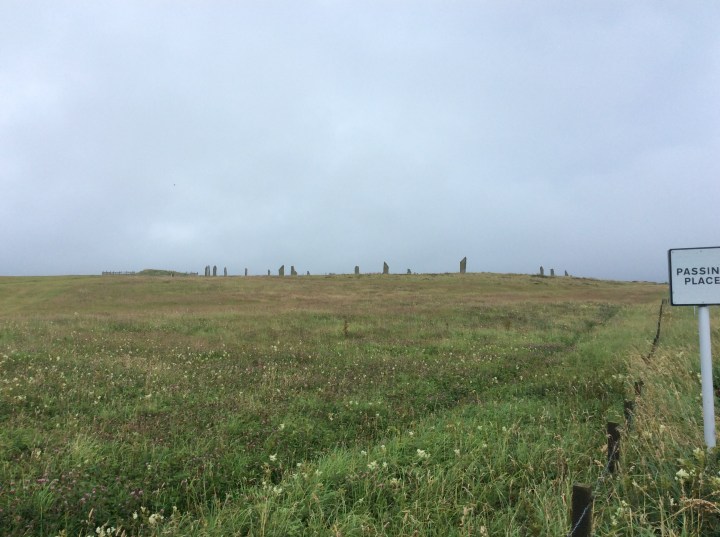 These are the stones of Stenness – these predate Stonehenge. A tenant farmer tried to blow these up with dynamite but was stopped by the local population! The two concrete blocks mark where another couple of stones stood. In 1906 one if the stones below that had fallen was replaced by 8 men and a wooden scaffold. For scale these are about 15 feet (5 metres high)