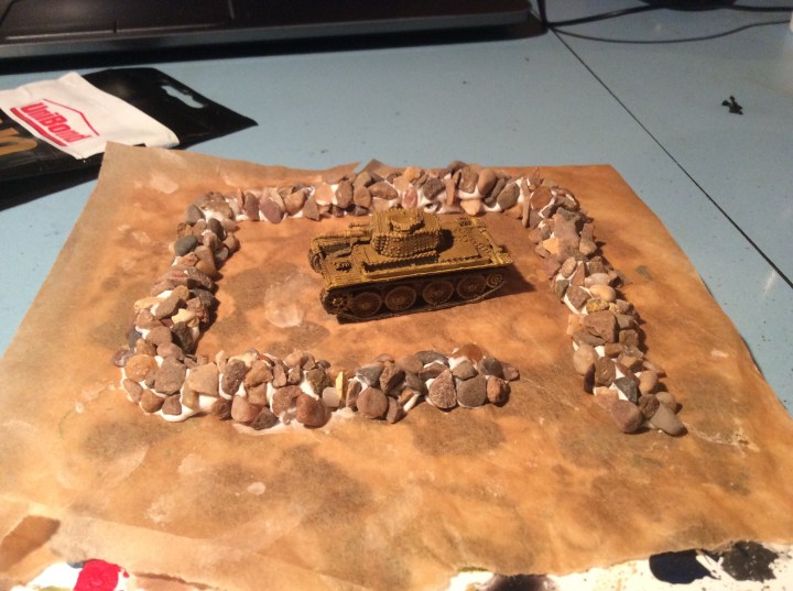I will make a few more of these to spread around the table to act as cover. This is a low one, either this, or the next ones will be taller. I will add more pebbles with Wood glue to cover the ‘no more nails’ . I decided to use this stick stuff as I had an open tube that needed using up.