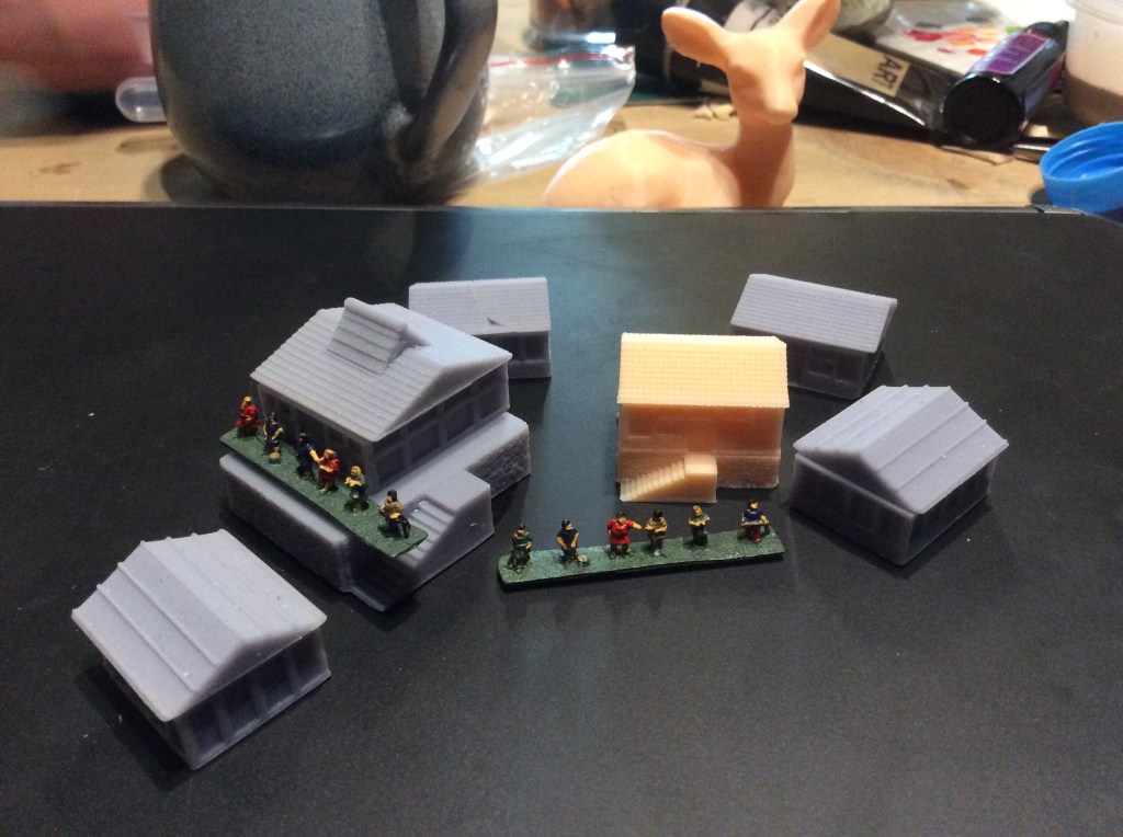 Resin versus Filament. At this stage I really cannot tell the difference. The one weird thing on the resin is that one of the houses is actually slightly Smaller than the other ones. Another weird thing is that the roofs just about fit. This will be easily sorted as I can print the roof at 51% and the house at 50%. I did manage to print a couple of Tori gates this evening, but sadly the bridge failed, for some reason one end detached from the build plate. In the background you can see the fawn I printed for my daughter as she wants to add it to a diorama.