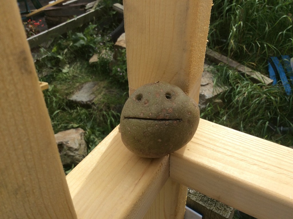 Here we have Bob, our mascot potato. Bob was born when I dropped my saw into the box of potatoes. My daughter found him and added eyes. He has pretty much been on the build every day since then.