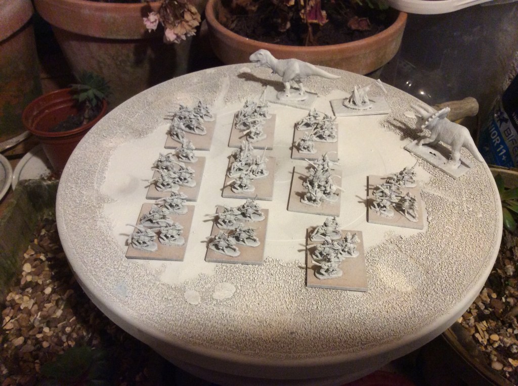 Was still feeling a bit ropey today so went looking for the box of 10mm stuff. I found it and sorted out some Mongols and also resprayed some Magister Dinosaur.