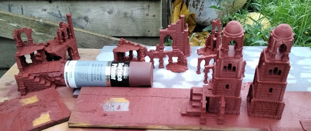 This evening started off on a roll. I got the 28mm ruins from the Frostheim set sprayed their base colour. I decided to do these in browns instead of my usual grey. For this reason I went and bought a chocolate brown spray paint, which turned out to be more red than brown…