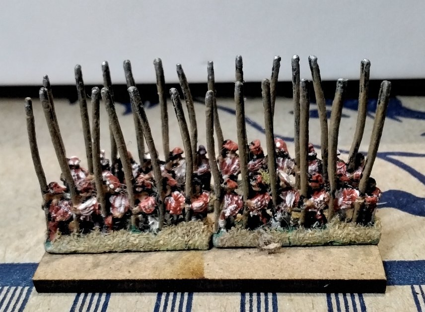 I have come across a bit if a conundrum regarding Pike blocks, now a strip of pikes costs 44 pence on its own on a 20 x 40mm base it looks naff. So I would need two on there… like this: