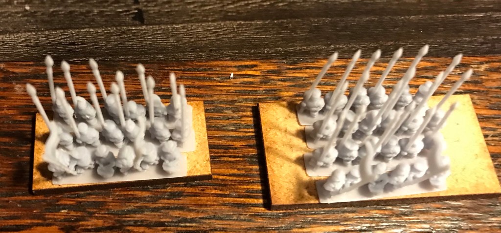 It got me thinking, do I need to have the miniatures covering the whole base as in the case of the right hand unit, or could I go for something smaller to base them on. This reduces the ranks to three. Now the one thing I couldn’t find straight off were the irregular miniatures to try them on the front rank. I will have a ponder at this problem tomorrow with them in situ in the front.