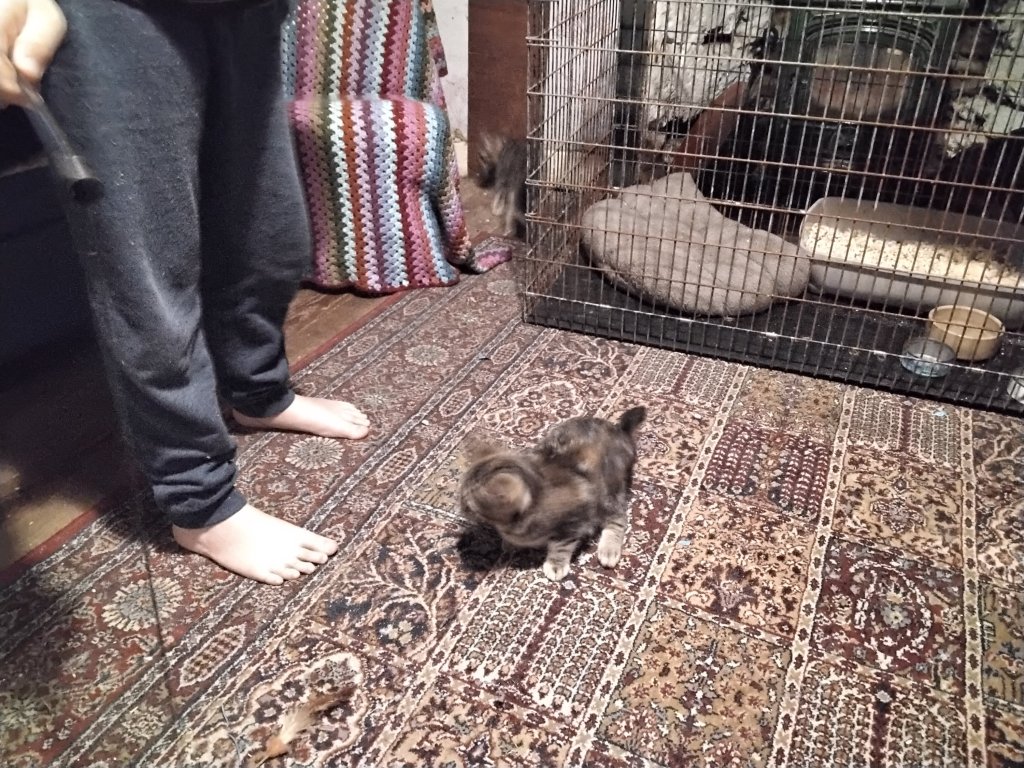 The kittens are in the crate in he background… as they were feral they were scared so we gave them time in safety to get more used tomus and the dog. I reckon if we just had the one in the foreground (Gizmo) then she would have been out a while ago, but Pixel, in the background was extremely nervy, so we gave them the time they needed.