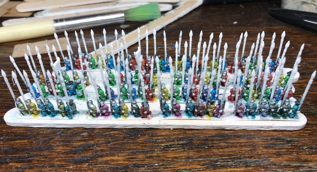 Yes, back to the pikes again… weapons, base, feathers and flesh to do and they’re ready for glueing down…