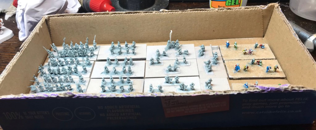 After a day of working with the comedic thumb protector on I decided I would try some painting. I managed to get the grey basecoat on the 6mm forces Ihad chosen to make a start on. I also managed to get some colour on some too. Sand has been added to hide the bases.