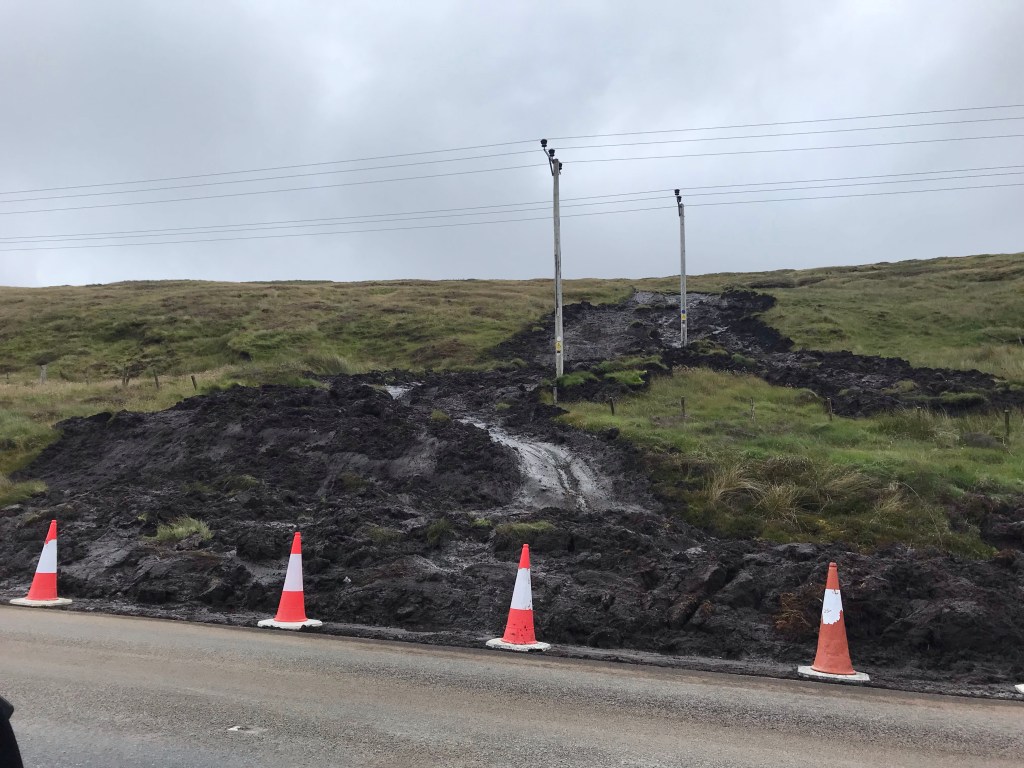 We have had some dry weather followed by torrential rain and voila, the peat is lifted off the bedrock or lower layers and careens down the slope… in this case straight onto the road. It got as far as the white line up the middle. This is just a little one!