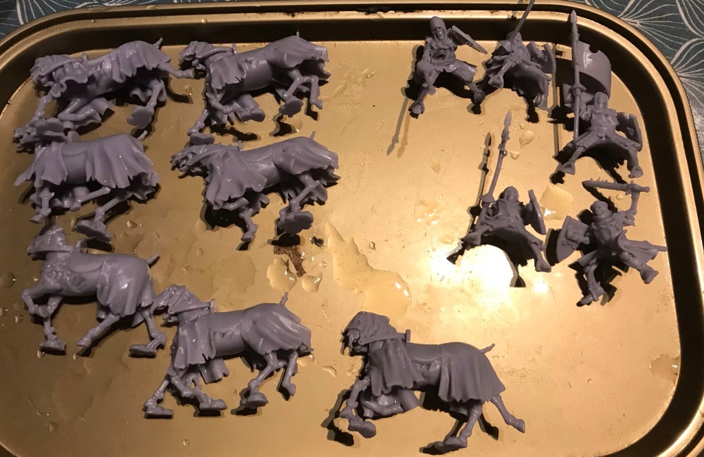 I also got the cavalry printed too… upon saying that. When I got them off their supports I realised that there were only five troops and six horses. There is a seventh horse. I am seeing if the female vampire from the Zombie dragon will fit on it.