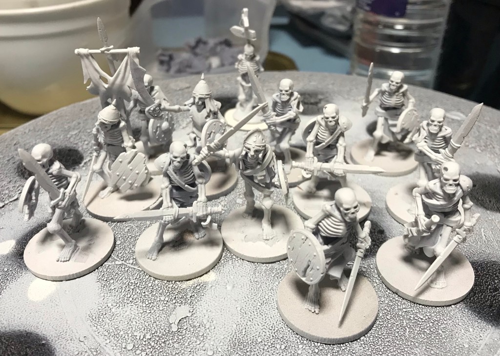 So I got the skeletons with swords onto my few remaining round bases… well actually I had to take some minis off four bases to make the full twelve. I could have used 2p’s but was concerned that the weight of the coin might cause damage to the swords etc.