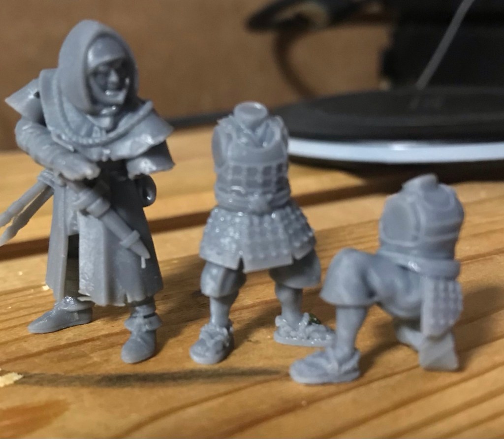 And??? I hear you ask. Well flexibility can cause problems as the miniature can twist away from the supports ( well I think that is how it works). The bodies are thick enough to survive this… arms and heads are small enough to allow the flex. Notice the missing arm on the bowman is his bow arm. I printed twice and voila… two dudes without their left arm.