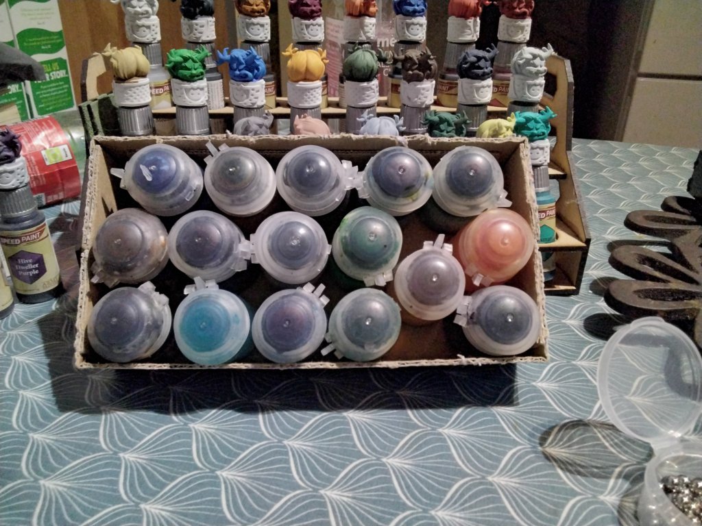 This evening I decanted a further eighteen of the Contrast paints. The great advantage as well as not drying out is that you can fit more in the same space.