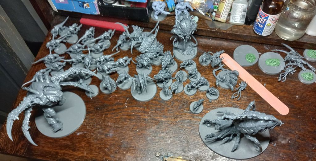 I now have this lot to paint. As my bases didn’t have holes in them then I cut off the pegs to nearly all of them apart from four where I felt the contact on only one spot was pushing my luck. I therefore added some Greenstuff and once dry I will add the miniatures peg and all.