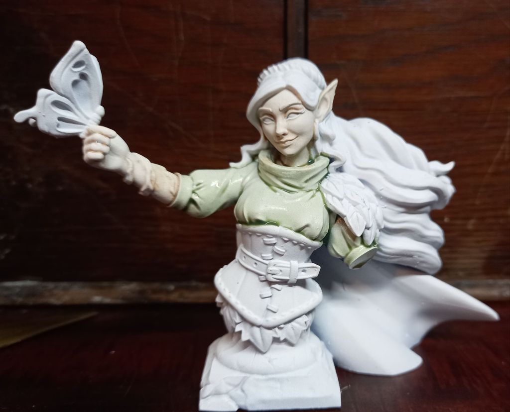 I went for a pale green for her top, well I thought it befitted a druid. A couple of things are going through my head as I look at this… autumn or summer for the leaves and the original art has the butterfly as some kind of a glowing ethereal creature… not sure if I am up to object source lighting yet, especially not at this scale… something to ponder down the road.