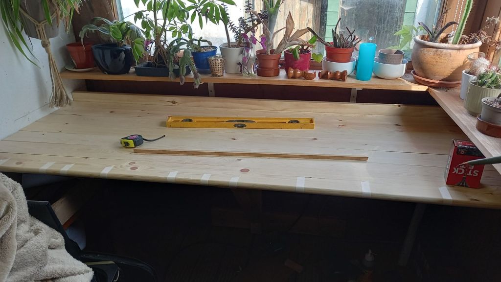 The tape is to hold on the semicircular profiled bit of dowel while the glue dries. This is there to avoid a hard front edge. The planks are still loose at the minute in case changes are required.