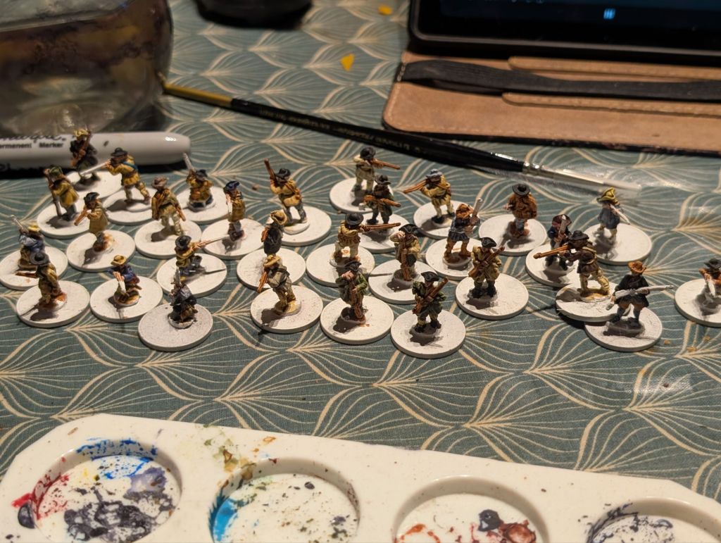 Well this evening I worked on the militia a bit more. Nearly all of the white has gone. I have been tending to rush these as I want them out of the way. By rushing I mean when I can actually get round to painting them. Having them sitting there glued to pennies and undercoated is not exactly speedy work…