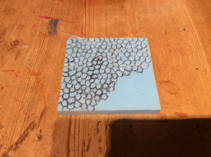 The big blob of foam was trimmed down to something roughly hill shaped. This was stuck down onto the EPVC. I prefer basing on this as it won’t warp when the PVA is used.