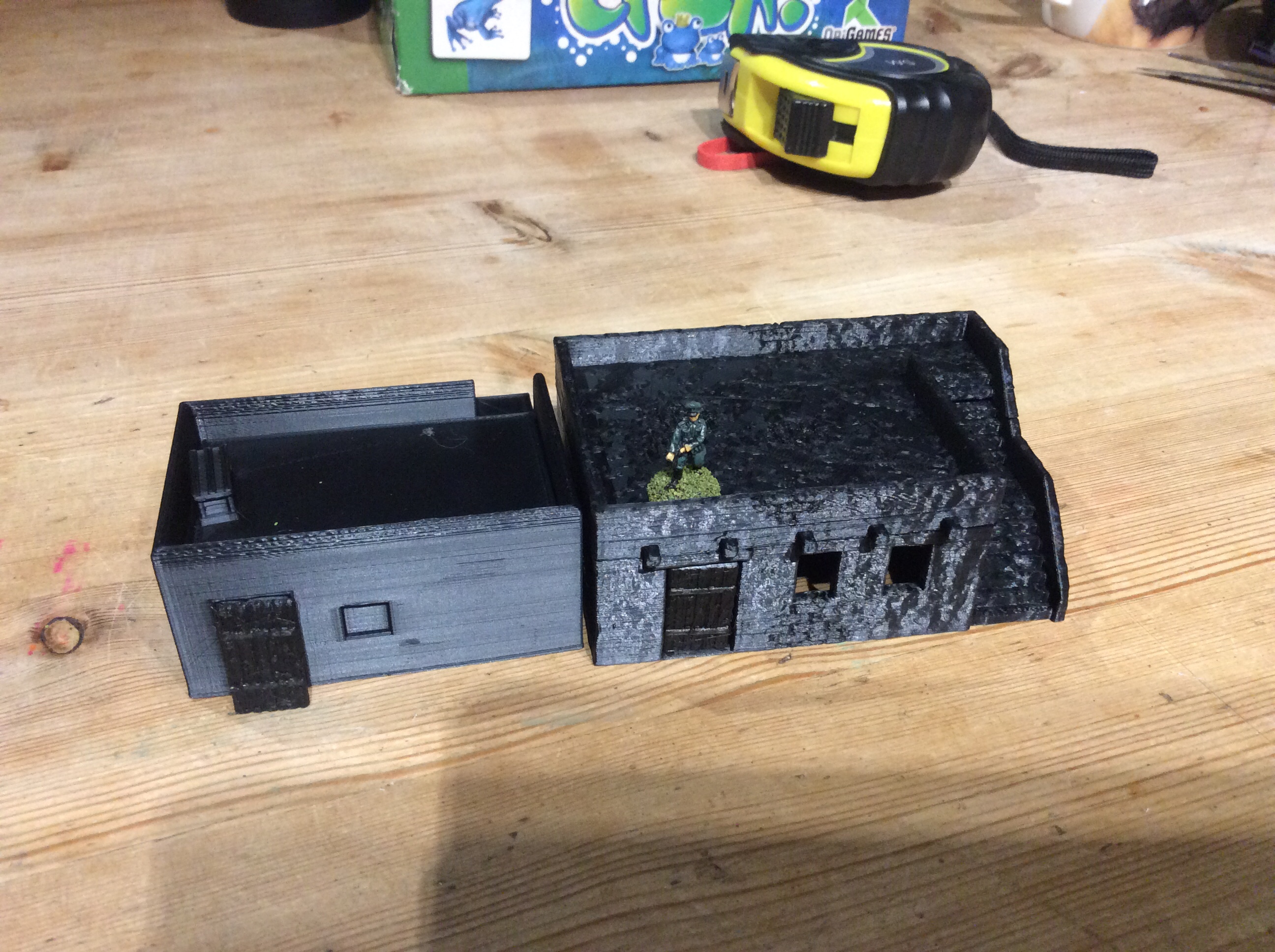 The one from Jonny is a nice simple design with a roof that drops in. It doesn’t have a door (it is from the other house) I just stood one up against the hole to see what it looked like. It has a full base too. This one is designed for 15mm miniatures.