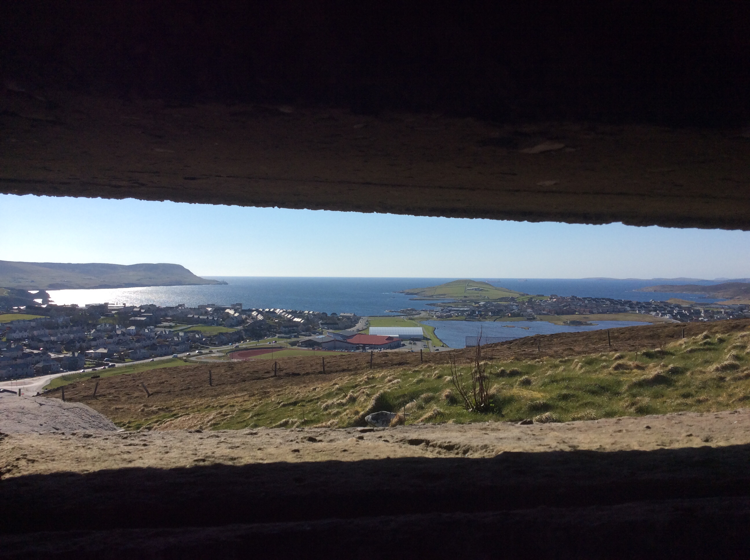 The view out of the slit is off the South end of the harbour, the land beyond the sea on the left is the island of Bressay. The green lump jutting out to the sea is where the main seaward battery sat.
