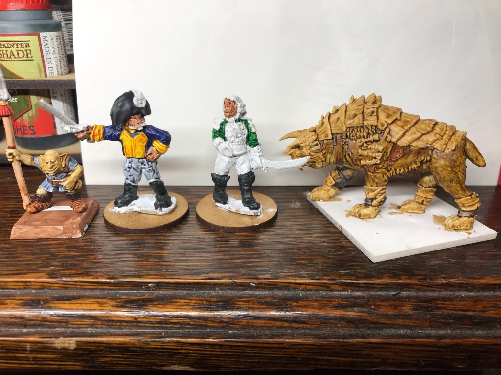 I did another skirmish unit for the Italian wars… it won’t win any prizes but it is done. Funnily enough these seemed a lot easier than the last set of three bases. I honestly think it was mental state rather than difficult miniatures. The 15mm monster hunter miniatures probably cleaned the palate for want of a better term. I want these finished and out of the way. I think the destruction of two Pike blocks put a downer on the whole project. I also brushed on an undercoat for my two ‘Spanish’ Officers as well making a start on the terror birds…