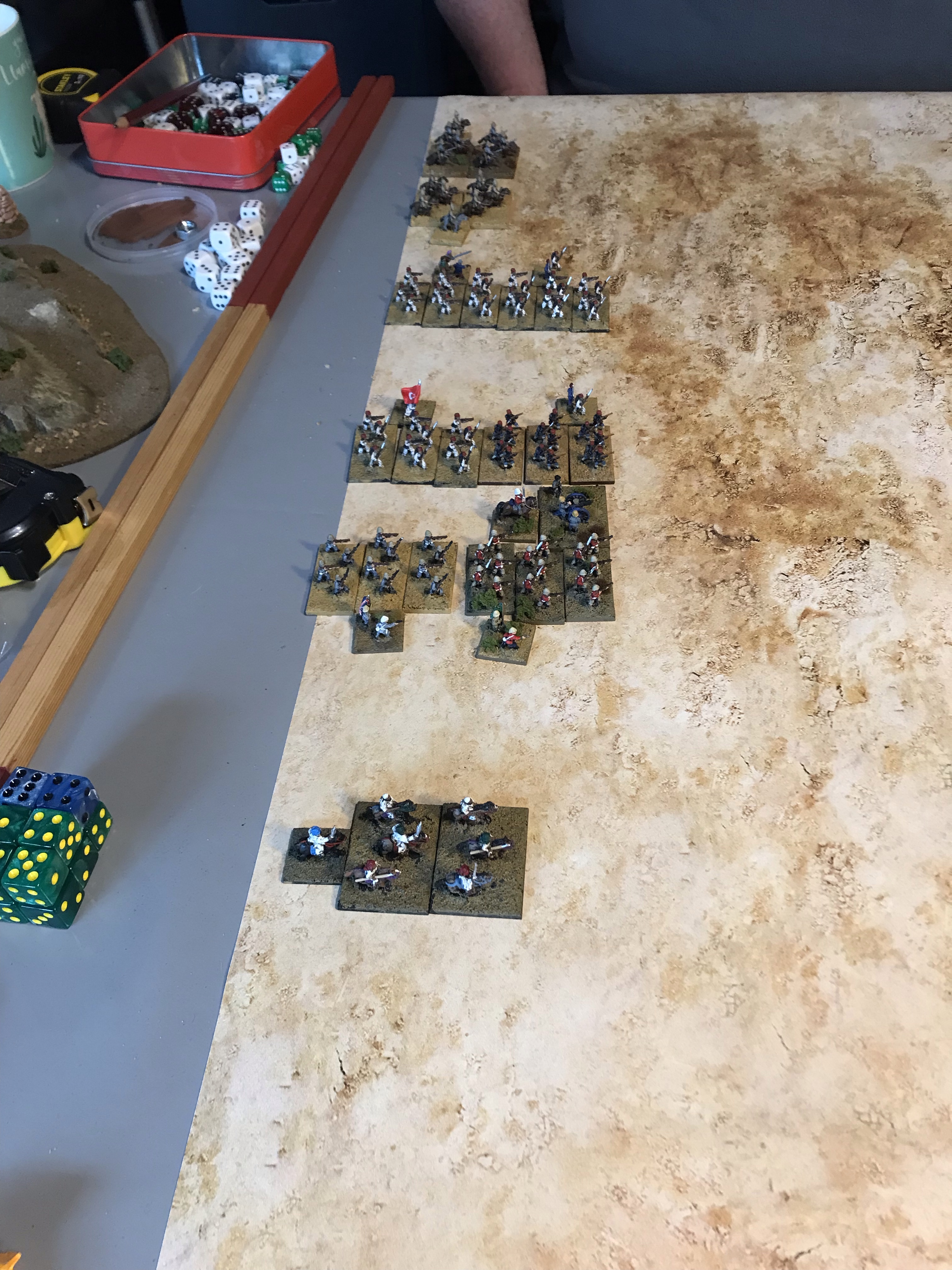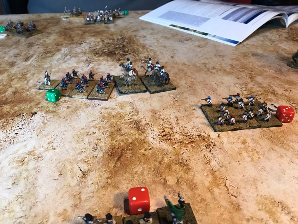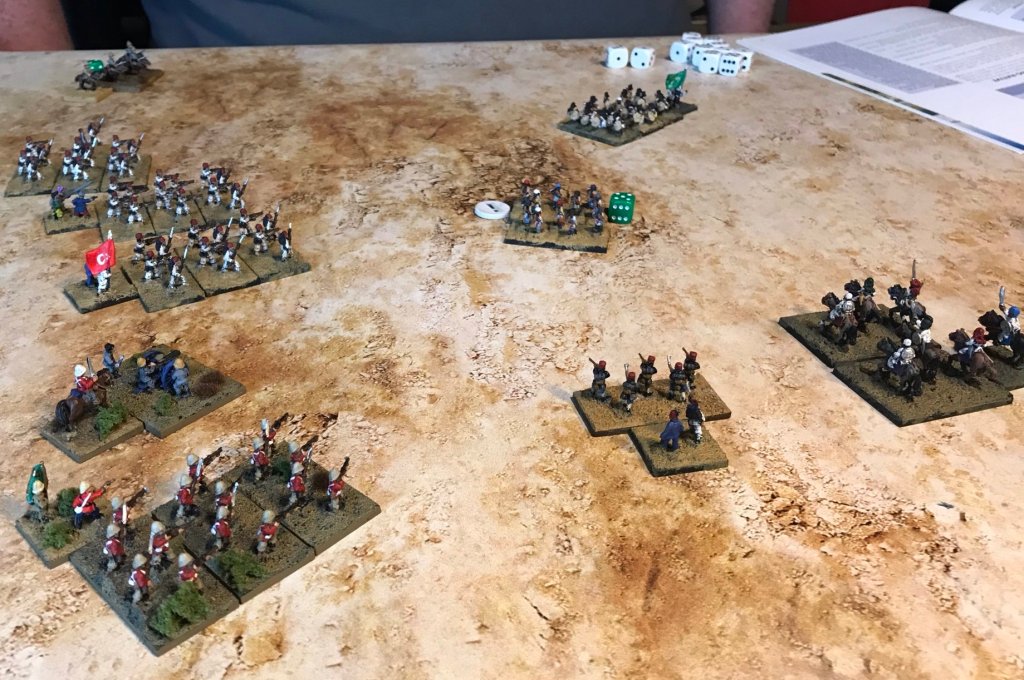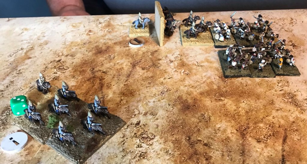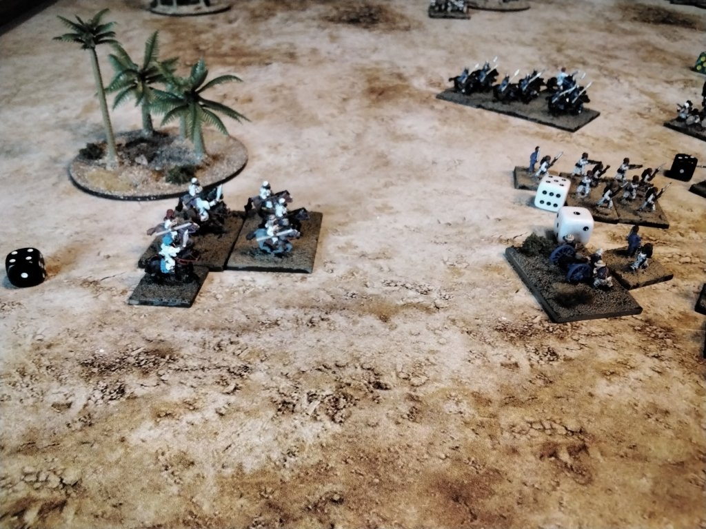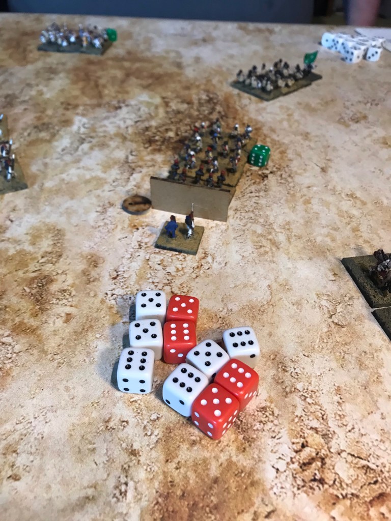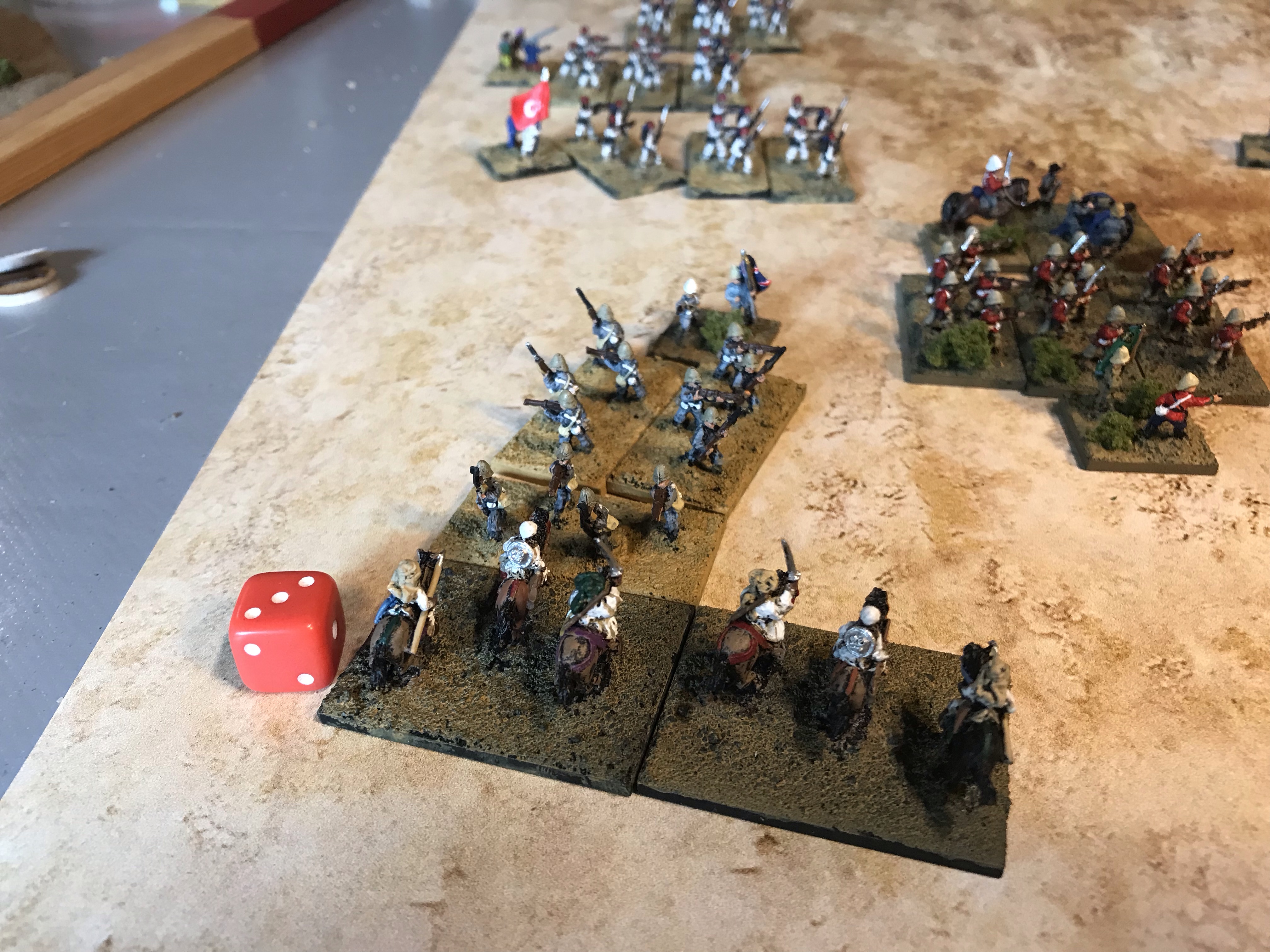 My subterfuge was to put the useless troops as far away from the fighting as possible…it worked as their dice rolls were impeccable and as I was rolling 8 plus on all of my dice the fact they were useless wasn’t obvious. The force steam rollered forwards and engaged the cavalry in the trees. They took a couple of casualties, and then got annoyed by the firing and charged… sadly they fell short and were caught in the open. All of my units managed to fire and made short work of them and the unit of fanatics coming up behind.