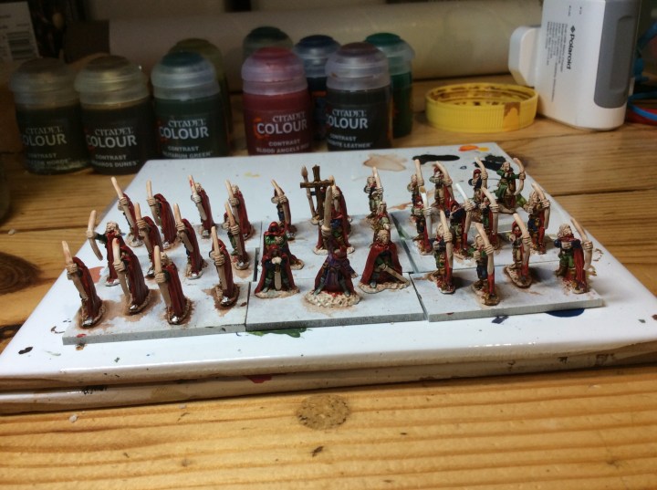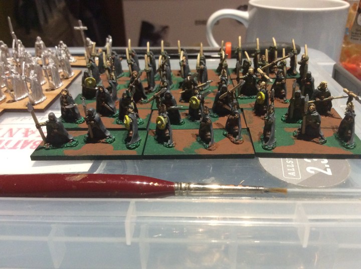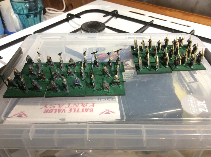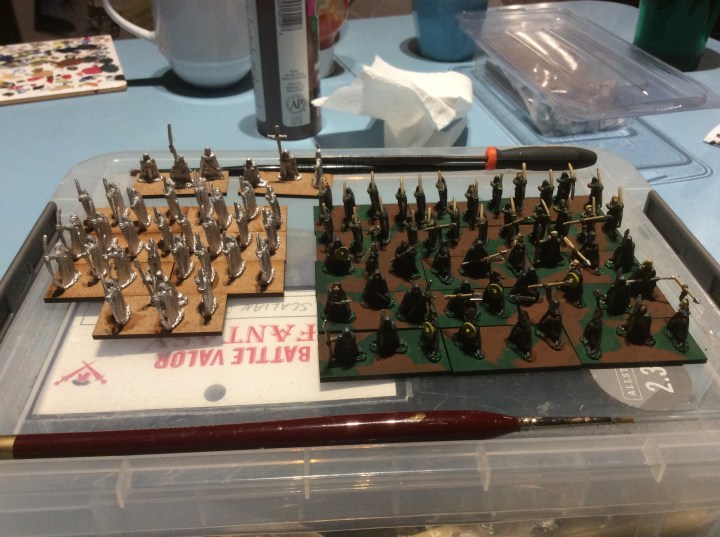 Now if you remember, the last lot of these that I painted really ground me down (https://bogenwaldblog.wordpress.com/2019/04/15/back-to-the-elves/ ). Now I don’t know if it was the different paint, my state of mind or a combination of both, but basically I enjoyed painting these. The contrast paint really worked on them. As I only had three pots of it I painted with washes as well just to keep the momentum up. They have come along a bit since this photo was taken this evening. All that is left now is the metalwork, washes on the hair and then the bases painting.