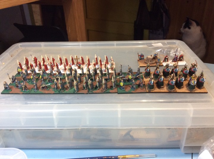 So, apart from the shields, hair and the metallics, these were painted in contrast paint. I do quite like it for this scale, I am still a little ambivalent about it in 28mm. Tomorrow I think I will make a start on some 15mm Lizardmen. I have just remembered that I have a ‘Tin Soldier’ 15mm Aztec DBA army sitting there too. They would make a nice opposing force to the Scalians.