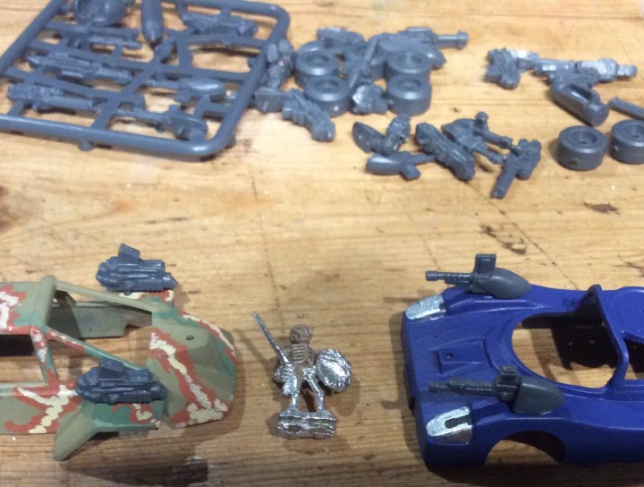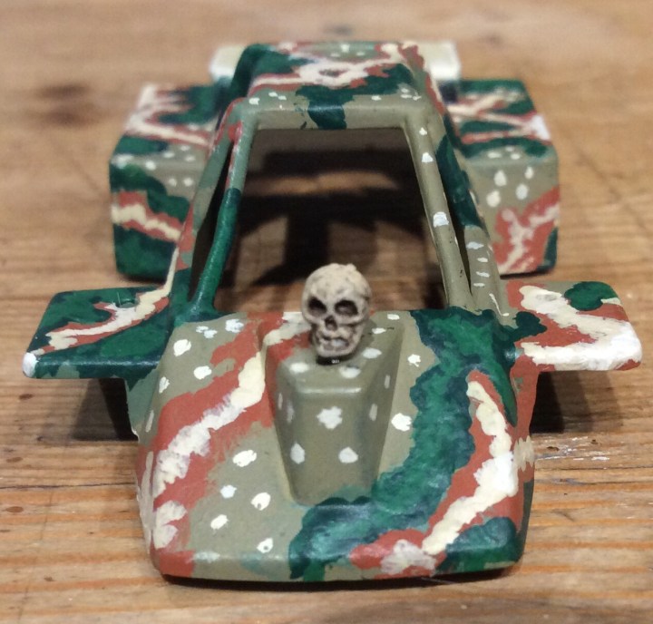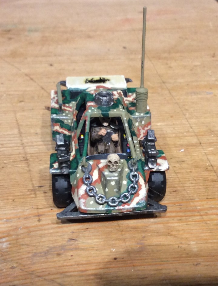 My drivers have been dispatched, which means I can get the cars finished soon. The piping on the interceptor was glued down and given it a blue wash. I am considering adding the missile launchers on backwards to the side holes just visible above the green bike. These would become either boosters or smoke dispensers. As the end of the hose is directly above the hole it might work….🤔