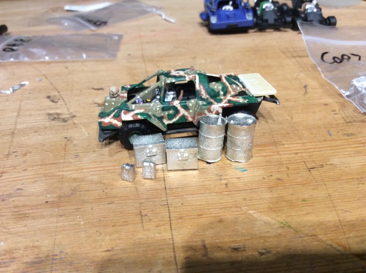 I am pleased to get them to where they are, I probably (or definitely) spent more time on these than I would normally. I would like to think it was because I was wanting to try and improve and not because it was a ‘challenge’… I know I thinned the paint a lot more and put lots of layers on (something I wouldn’t normally do with vehicles). Adding all the extras is something new too. I deliberately went out and bought extra bits and bobs, jerry cans and oil drums etc, not to mention drivers and people on foot. Maybe I was enthused by how well I thought they were looking!