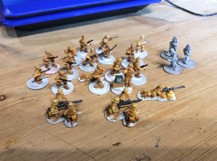 These ancient chappies must be twenty years old at least. They were from my days of playing Rapid Fire and from what I remember there is a company strength’s worth in the box. As can be seen I never got round to finishing them off. The paint job is pretty naff too. Desert Yellow with a chestnut wash. Somewhere I have a 75mm infantry gun and 50mm AT gun too.