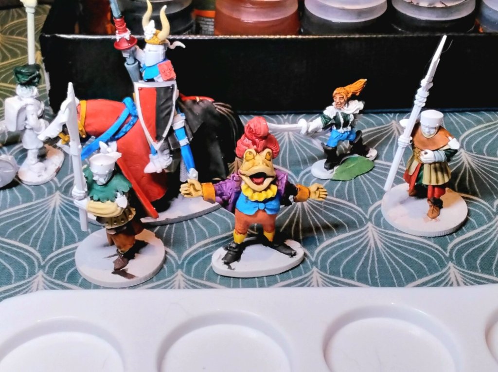 This evening I set to work with the Contrast paint. I did a bit more on the knight and his entourage as well as this Operatic Wide Mouthed frog from Alternative Armies.
