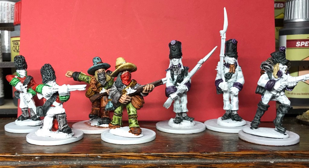 Two grenadiers, two irregulars, two line and a light infantryman. Obviously these are elves, but I have tried to use 1808 Spanish uniforms for ideas… as an example the grenadiers and regulars should have white cross belts, but as they are fantasy, then mine have black.