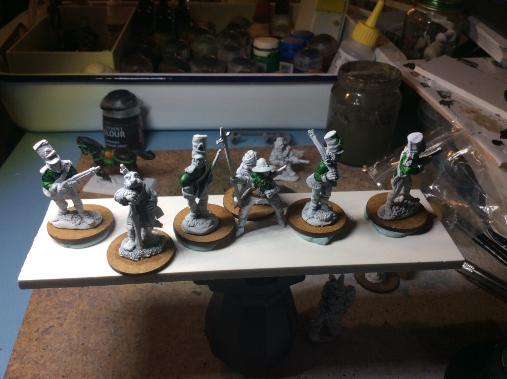I also made a start on my elf Rangers. These are basically Corsican’s (or Korsucan’s in game terms). So they will be In green jackets with red turn backs and snazzy blue trousers.