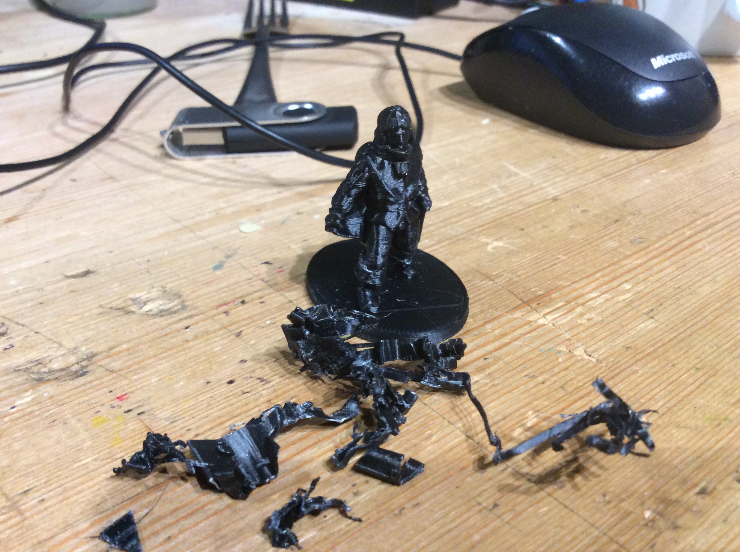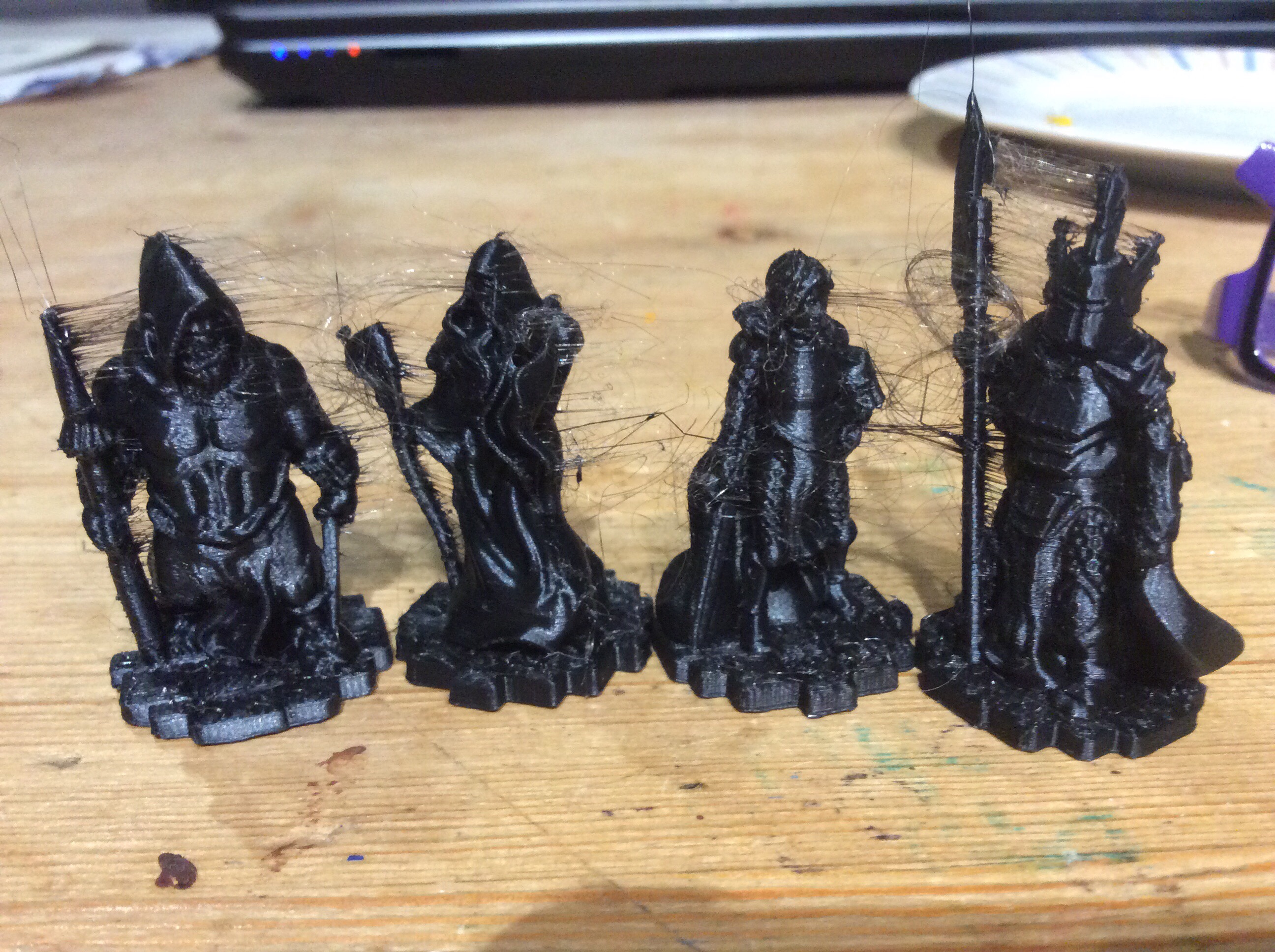 Last night I did a bit of research about the spider webbing on the prints. To avoid the print head bumping the models and knocking them off I decided to use the z hop option. This drops the plate a fraction as the print head moves from bit to bit. Seemingly this can cause more webbing than if you don’t use it. There still might be too high a temperature or over extrusion that is causing it. So instead of printing the same minis again I will print an extrusion test piece and play around with that.