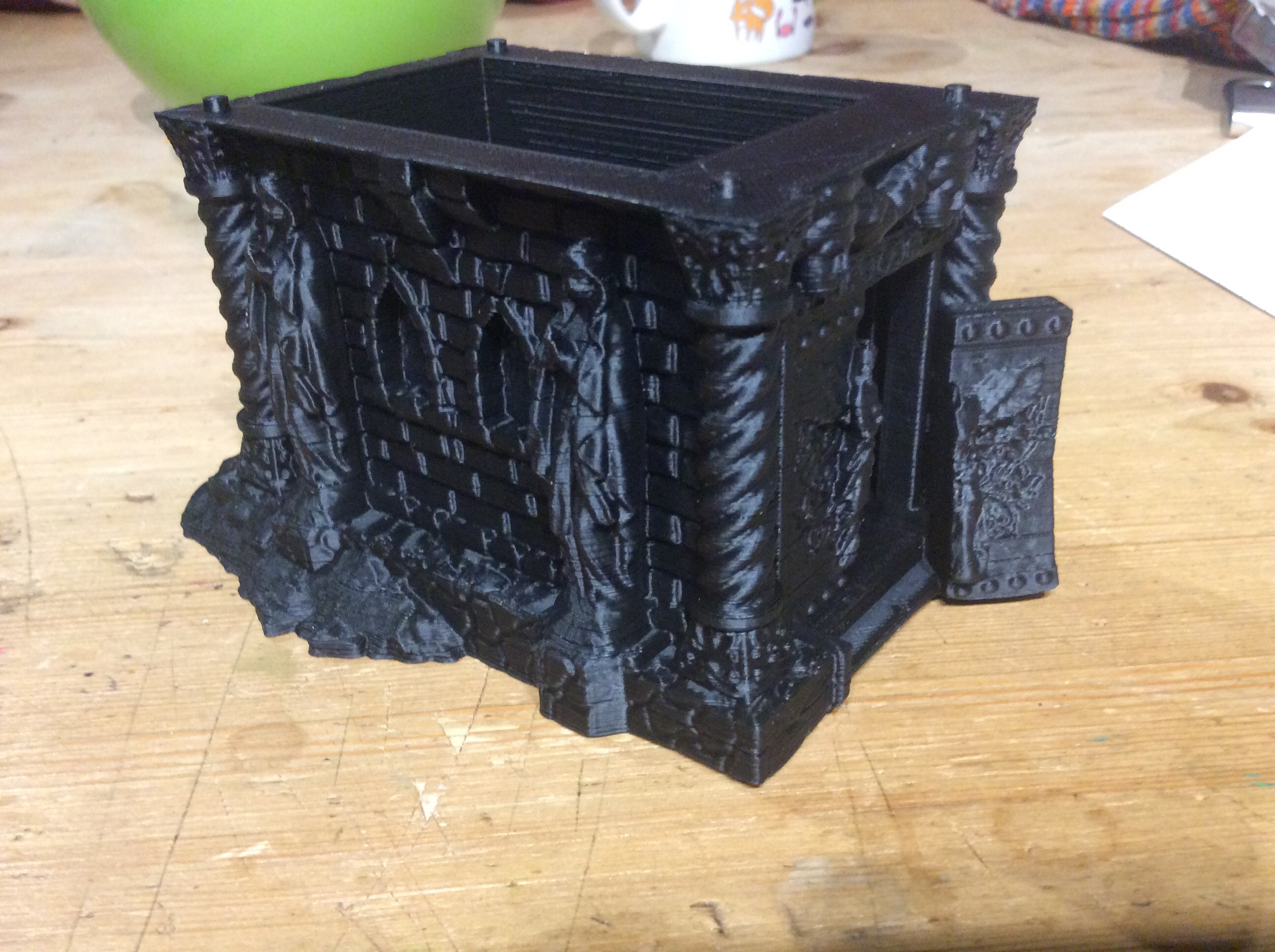 So … what next, well I have just started a 9 hour plus print of a ruined mausoleum… we will see how it comes out. I decided to print it at 0.2mm layers as opposed to 0.1. This speeded up the print by over an hour. The base weighs in at a whopping 85 grams… a whole £1.56 worth of PLA. That is if the printer doesn’t do something daft part way through.