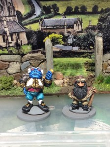 I have made a start on these two. I have a bit of a conundrum with the froggy. It is basically down to the colour of his skin. On the website he is a blue colour. I am not so sure about blue, but if not, then what? He is meant to be mega rich, so his clothes are vivid colours with gold brocade ( base colour on ready for dry brushing with shining gold then top highlight with burnished gold). The dwarf is still in a base colour stage. I will get him further tomorrow.