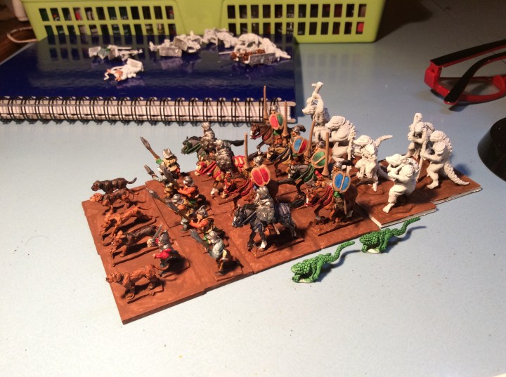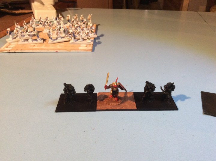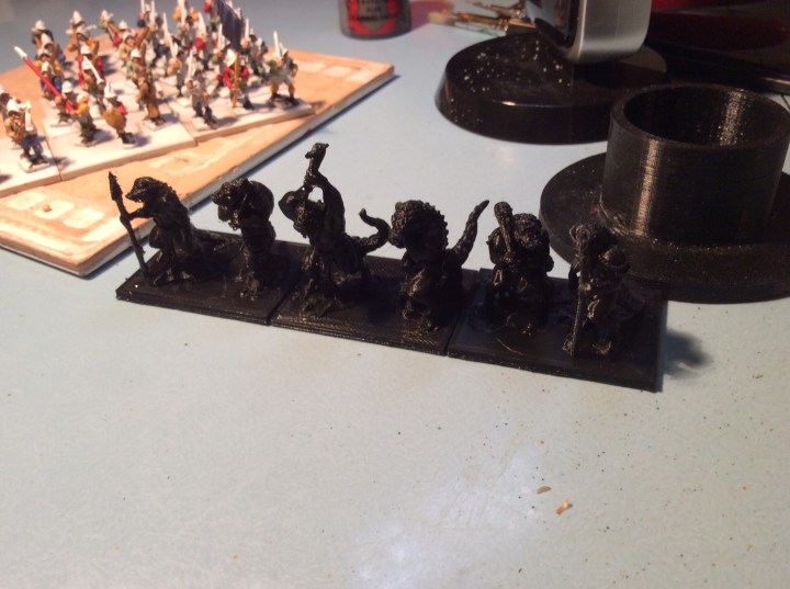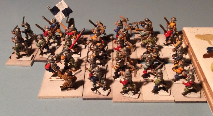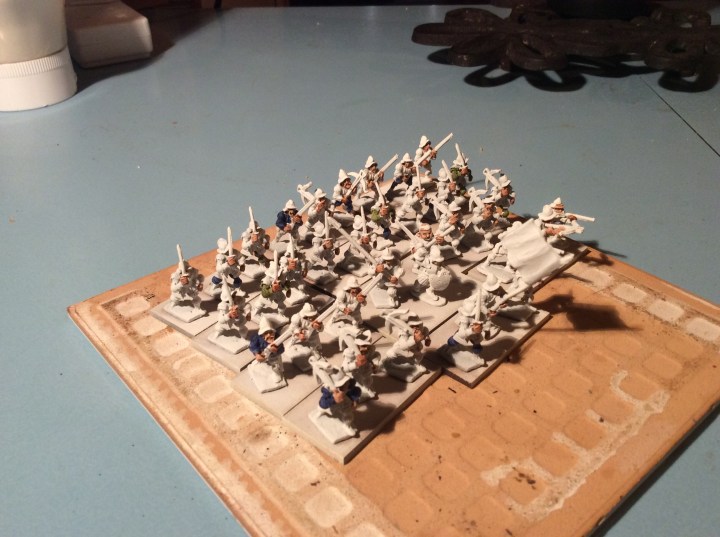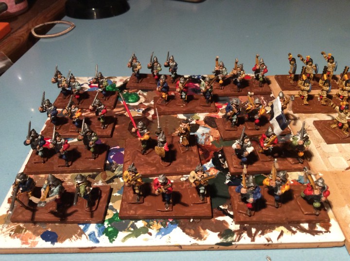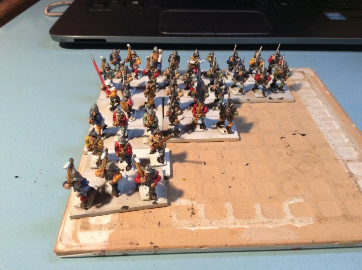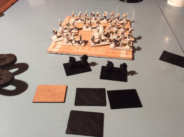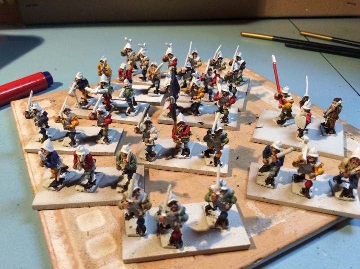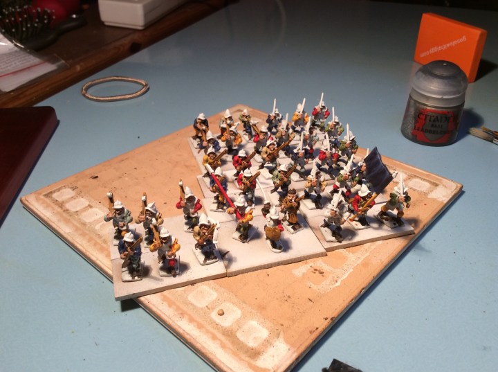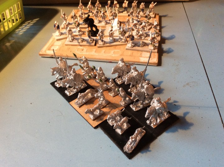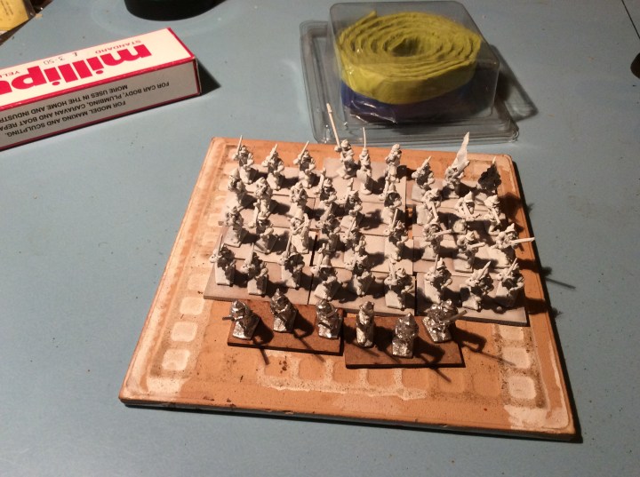 Two bases of cut down pikes, my plan is to give the Greenstuff pointy bits. I am now taking bets on how far I have painted them before I remember 😉.