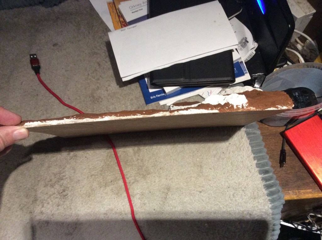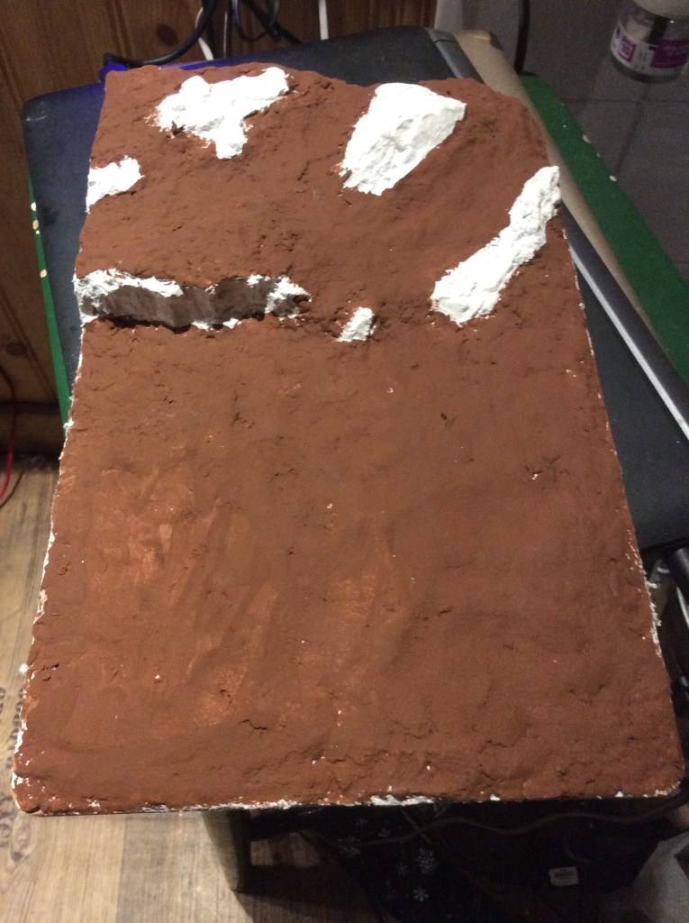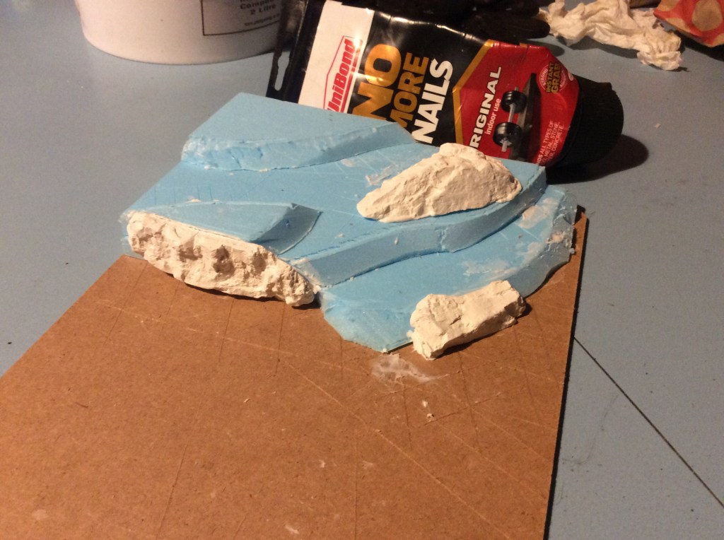 This evening I got some more rocks stuck on. I scored the baseboard and then used the hot glue gun to get some uneven surfaces to allow the basing stuff to hang onto. I got the Compound mixed up and splatted on. Once it was going off I tried smoothing it down with water. I met a bit of a problem in that as I have had it a good old while then the plaster went off a bit quicker than I expected. Anyway this is what it looks like after the messy bit…