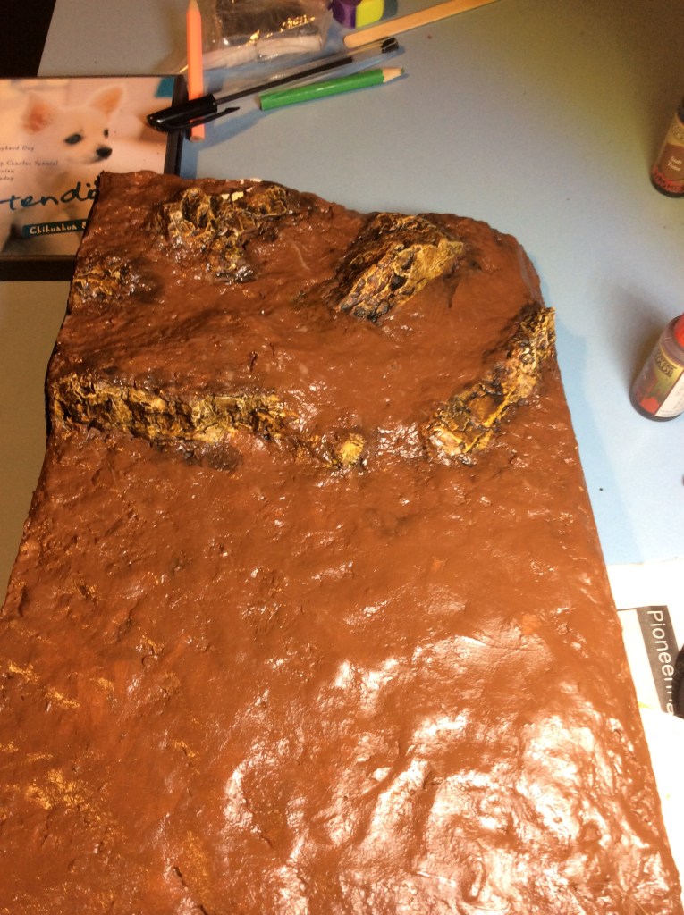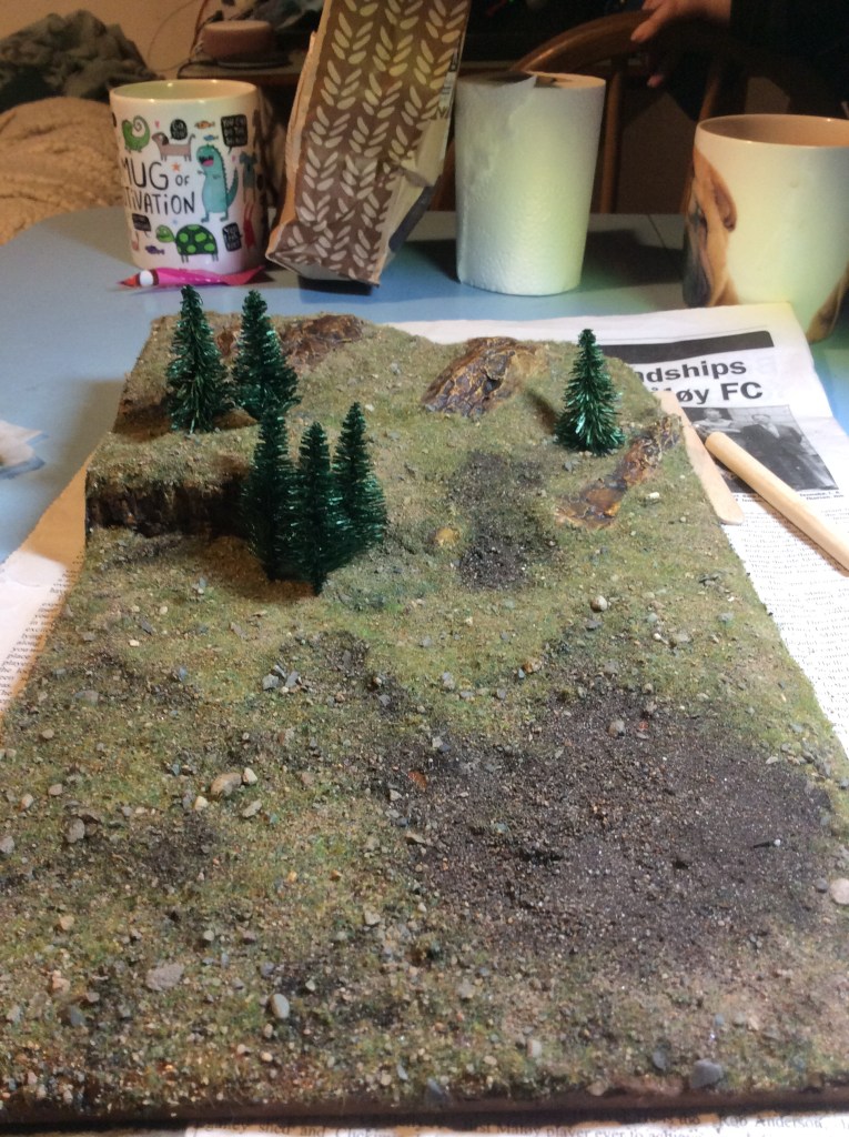 It’s a bit shiny at the minute as I covered it in PVA to give it a bit of protection. Unfortunately My fingers were a bit tacky when I touched the rocks at the back and I managed to peel the paint off them. When everything has dried then I will get them recovered and then protected too.