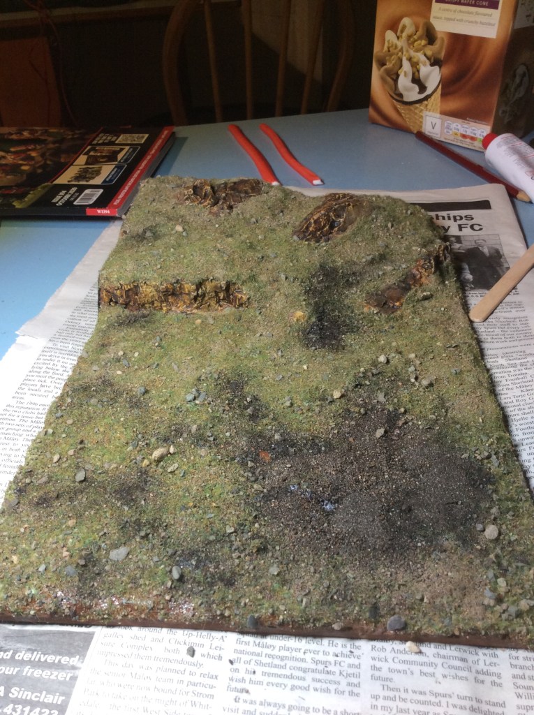 Well, that was a bit of a worrying day regarding this thing. The stuff I covered the groundwork with yesterday was the fast acting basing glue and as such it didn’t dry. Thankfully flock was going over the top so it was saved. I added a lot more of the basin glue to make sure it was stuck down.