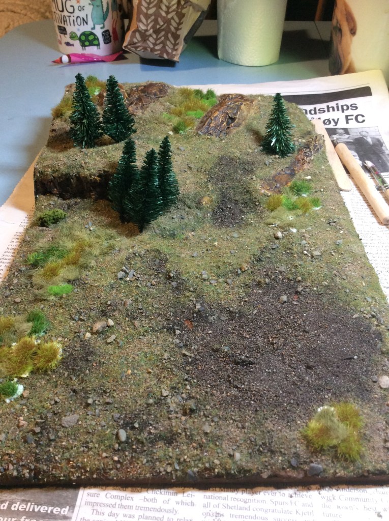 As you can see the glue hasn’t dried yet, the other thing that is noticeable is that I have shoved some trees on. I got these years ago for about 10p each, I think i got fifteen for a quid something like that. Anyway these are cake decorating trees for the average Christmas cake, but as I found them when I was looking for tufts, I thought I would shove them on and to be honest I don’t think they look too bad.